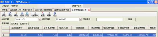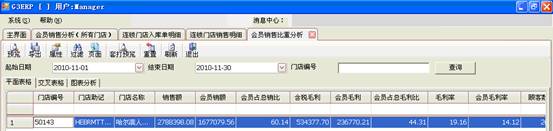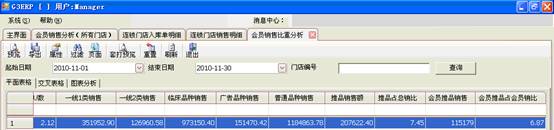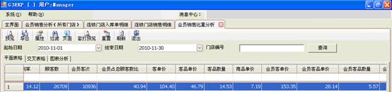 ※“毛利率”与“会员毛利率”的比较分析:一般情况下“会员毛利率”剔出“会员折扣差率”后,要与“平均毛利率”基本是一样的。如果“会员毛利率”小于“平均毛利率”,那就危险了,那说明会员是到店里来是 “淘便宜货”的。例如上图“会员毛利率=14.12” 、“平均毛利率=19.16”,企业又没有启用会员折扣,二者差异5%以上,就明显说明会员对企业的价格体系是不认可的,说明会员到店里来只是选择那些他们熟悉的敏感商品而已。