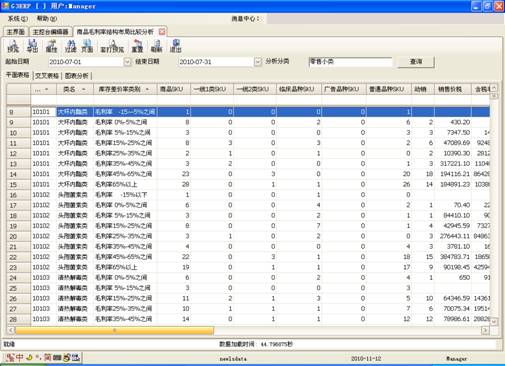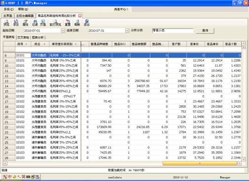 “综合销售毛利率”与“综合库存差价率”比较分析:“综合销售毛利率”是指总毛利与总销售的比值,“综合库存差价率”是指零售价与进价的差率。如果“综合销售毛利率? 综合库存差价率” 表示实际销售的高毛利产品较多;如果“综合销售毛利率 < 综合库存差价率” 表示实际销售的低毛利产品较多;两者的数据不能差别太大,如果差别大了,要么就是“强推”,要么就是“无主推”。
