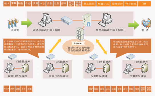 由于批发委托配送的批发与零售连锁企业财务账一般是分开核算,批发到连锁公司的帐务处理非常重要。雨人软件为企业构建了完整的数据流程:门店直接从批发企业请货,门店从批发企业接收配送数据。门店核算数据进入连锁帐套内,形成了完整的“三角”数据结构,即满足了企业实际应用,也实现了业务财务一体化管理需求。分销任务平台的个性化定义以及凭证模版的个性定义,很好地满足了企业的实际业务需求。