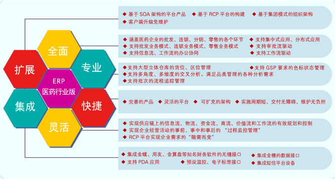雨人ERP医药流通行业解决方案架构在雨人RCP平台之上,雨人的RCP开发平台内置了单据定义平台、序时簿定义平台、单据间勾稽定义平台、权限定义平台、审批流程定义平台、报表定义平台、打印格式定义平台、界面设置平台。可以根据企业的实际需求,通过模块、功能、流程、单据、报表、套打、接口、权限和环境等环节的灵活配置,实现客户业务流程的快速定制和动态调整,实现客户可视化的修改、配置各类业务功能;同时,ERP集成的开发工具可以帮助用户实现从业务建模、流程配置、数据集成、设计开发、异构集成到测试部署等一体化设计,快速构建医药流通企业集成、可扩展的应用,满足企业的个性化需求。